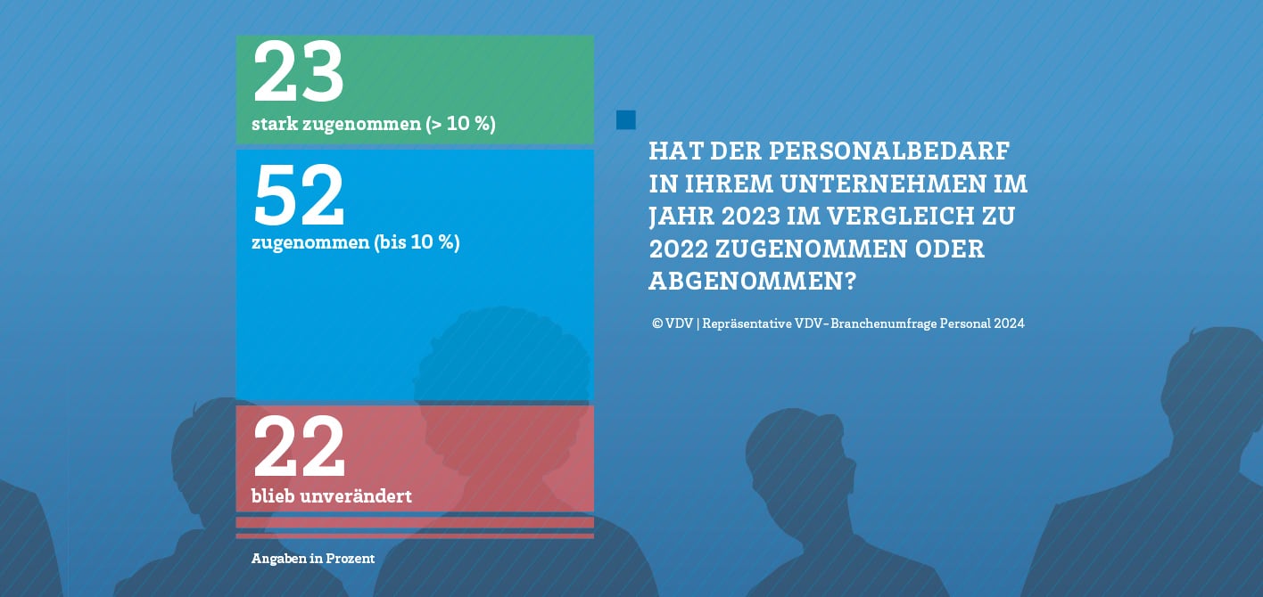 Dass es in der Verkehrsbranche beim Recruiting auch im Ausland noch „Luft nach oben“ gibt, dafür liefert die VDV-Personalumfrage ebenfalls Belege: Nur 13 Prozent der Unternehmen suchen in anderen Ländern aktiv nach Personal – ein Wert, der gegenüber 2023 nahezu unverändert geblieben ist. Etwas mehr als jedes zweite Unternehmen gab als Grund an, es zu schaffen, den Personalbedarf über den deutschen Arbeitsmarkt decken zu können. Die zweithäufigste Aussage war: „Unsere Personalabteilung kann dies nicht (auch noch) leisten“, knapp gefolgt von: „Wir haben uns damit noch nicht beschäftigt.“