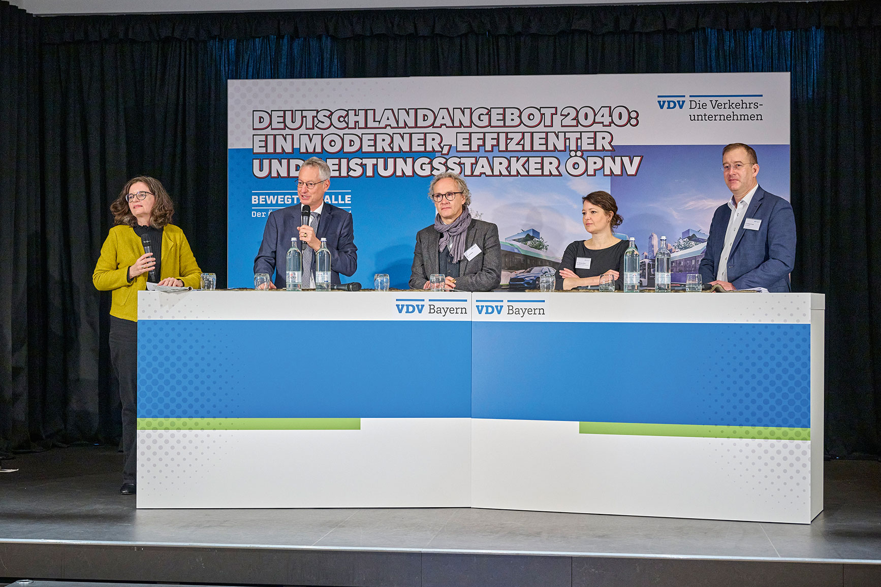 Podium in Straubing (v. l.): Moderatorin Sonja Ettengruber, Markus Pannermayr (Straubinger Oberbürgermeister und Vorsitzender des Bayerischen Städtetages), Dr. Josef Rott (Bayerisches Staatsministerium für Wohnen, Bau und Verkehr), Dr. Vanessa Roden (ADFC Straubing) und Dr. Robert Frank (Vorsitzender der VDV-Landesgruppe Bayern) diskutierten über die Perspektiven des ÖPNV in Bayern bis 2040.